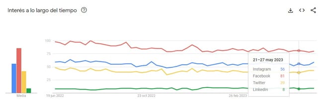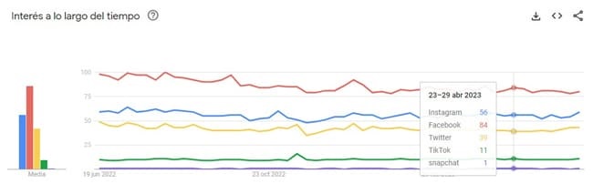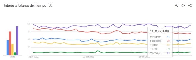 Gráficos de Google Trends de lo que se busca sobre las diferentes redes sociales Instagram, Facebook, Twitter, LinkedIn, TikTok, Snapchat y YouTube. Hemos incluido a YouTube que además de ser una red social de vídeo, os compartimos un dato: YouTube es el segundo buscador más usado del mundo sin contar el buscador chino y el buscador ruso